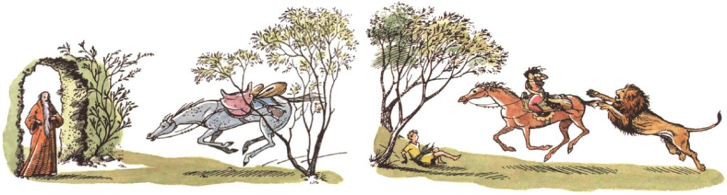 — Bree, dit Aravis, que cette histoire de coupe de poils n’intéressait pas beaucoup, il y a une chose que j’ai envie de vous demander depuis longtemps. Pourquoi jurez-vous tout le temps « par le Lion » et « par la crinière du Lion » ? Je croyais que vous détestiez les lions.