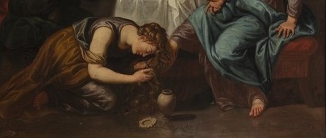 Aux pieds de Jésus se tenait une femme. Elle avait pris place au bout du divan où il était allongé pour manger Elle était passée inaperçue pour la plupart des personnes présentes car elle avait dû se glisser derrière lui à la faveur de l’obscurité. Elle pleurait et mouillait de ses larmes les pieds de Jésus. Puis elle les essuyait avec ses cheveux et, en les embrassant, elle versait du parfum sur eux…