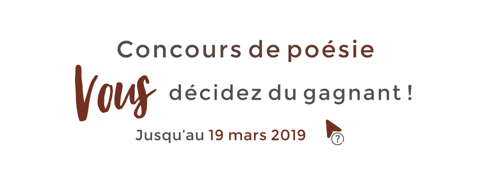 Notre concours de poésie 2018/2019 sur le thème Dans la tempête a rencontré un vif succès : nous avons reçu plus de 60 poèmes ! Notre jury d'auteurs, André Fillion et Yves Prigent, en a choisi 8 (au lieu des 5 initialement prévus) que nous sommes heureux de vous dévoiler aujourd'hui, en attendant la publication du livre… Lire la suite Concours de poésie : votez pour le gagnant !